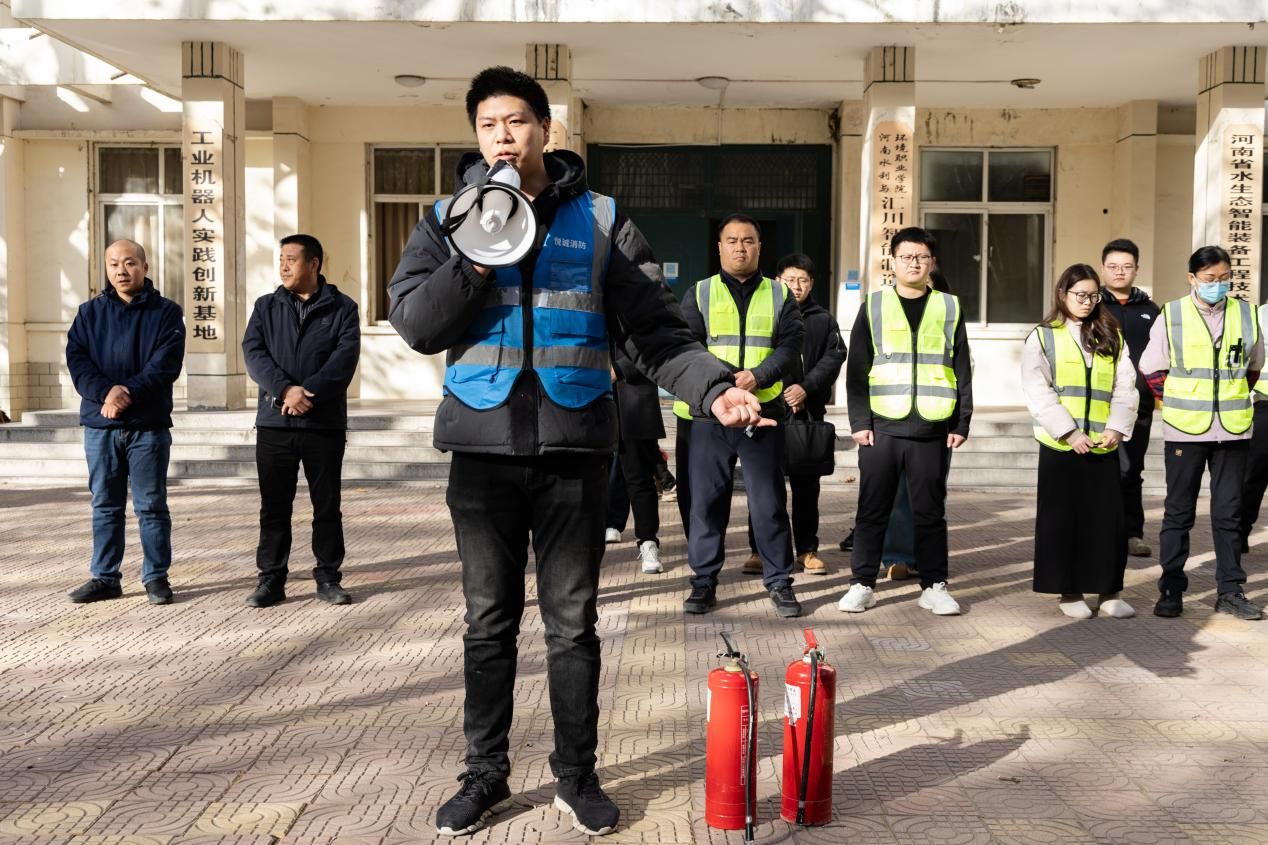 11月25日下午,为响应2025年河南水利与环境职业学院“119”消防宣传月专项活动,进一步夯实消防安全主体责任,提升消防安全意识,增强师生火灾应对能力,持续推进校园安全建设,创造安全稳定的校园环境,安全工作部、机电工程学院联合组织开展了冬季师生消防应急演练。安全工作部副部长李豫峰、机电工程学院组织员王远志、消防讲解员陈佳佳现场指挥观摩,师生代表300余人参加演练。