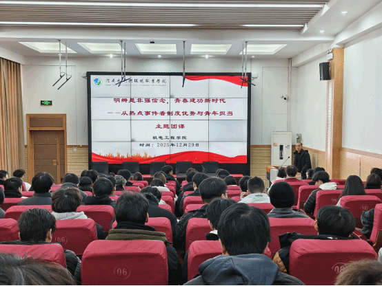 此次团课,不仅深化了学子们对中国特色社会主义制度优势的认知,更筑牢了其砥砺前行的理想根基,有效提升了青年学子的思辨能力与责任意识。下一步,机电工程学院将以此次学习为契机,坚守初心、勇担使命,以实际行动践行青春誓言,在为祖国、为人民的奉献中书写新时代青年的精彩答卷,让青春绽放绚丽光彩。