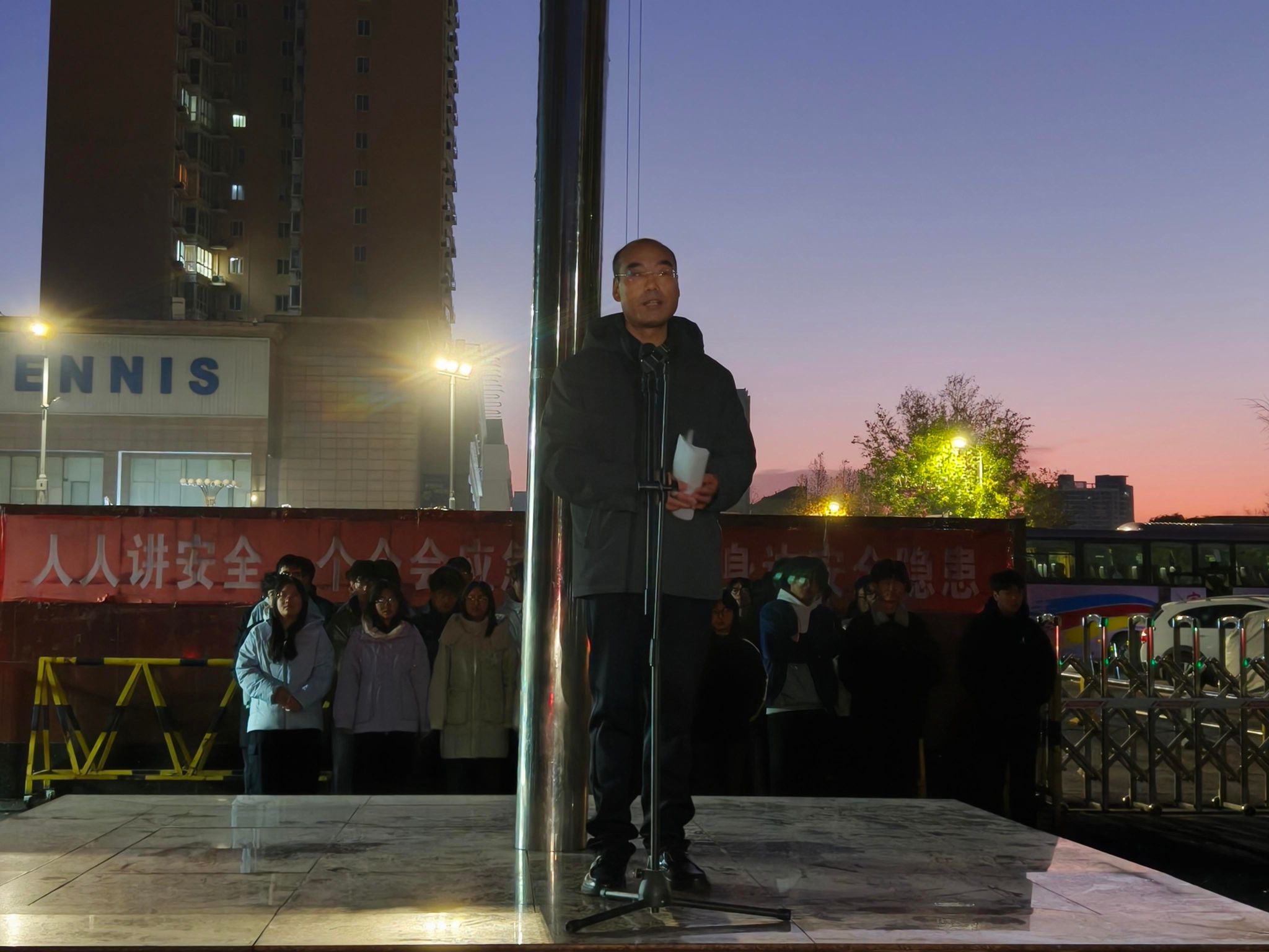 仪式上,学院党总支书记张国路做国旗下讲话,他从“以史为鉴,在血色记忆中凝聚自强守法的精神内核”、“以安为基,在双重警钟下筑牢守法尽责的校园防线”、“守护校园,在历史与现实的交汇处践行担当守法的吾辈使命”三个方面激励同学们要以史为鉴,自强不息,以安为基,守护校园。