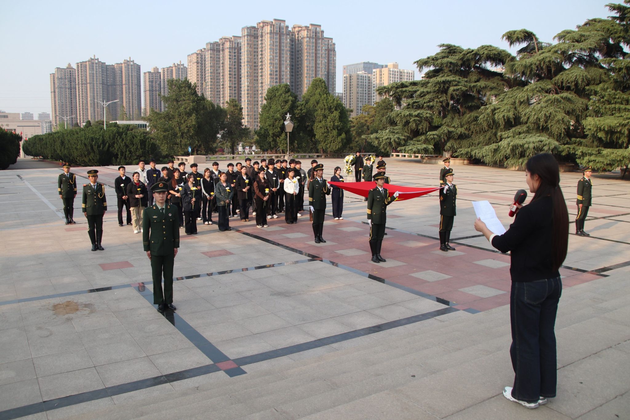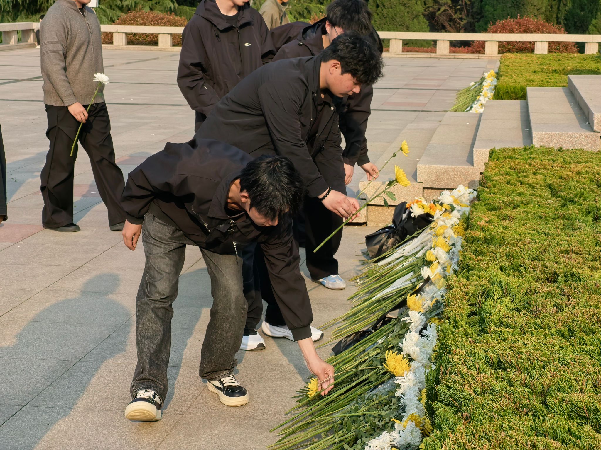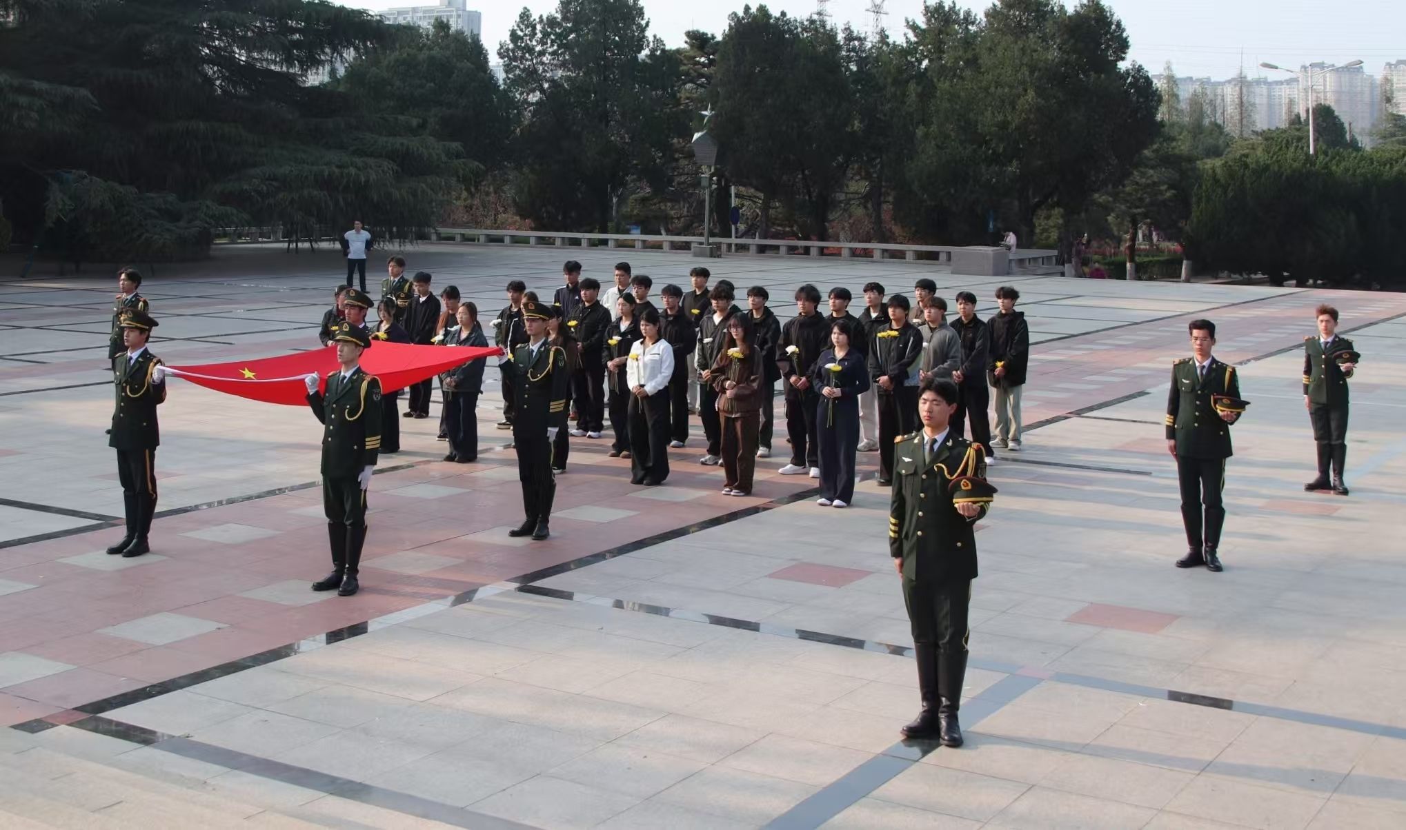 活动伊始,全体师生排着整齐的队伍来到郑州市烈士陵园,在庄严肃穆的烈士纪念碑前举行了简短又隆重的悼念仪式。活动现场庄严肃穆,挺拔的松柏如忠诚卫士,静静守护着长眠于此的英烈与先贤。全体学生身着整洁服装,怀着无比崇敬与缅怀之心,有序列队、肃立致敬,现场氛围庄重而肃穆。全体人员齐声奏唱《中华人民共和国国歌》,激昂的旋律回荡在陵园上空,每一个音符都凝聚着对英烈先贤的无限敬仰与深切缅怀。随后,全体人员低头默哀三分钟,静默无声间,革命年代的峥嵘岁月、英烈先贤为家国奉献的身影缓缓浮现,千言万语化作无声的哀思,深切表达对逝者的缅怀与敬意。